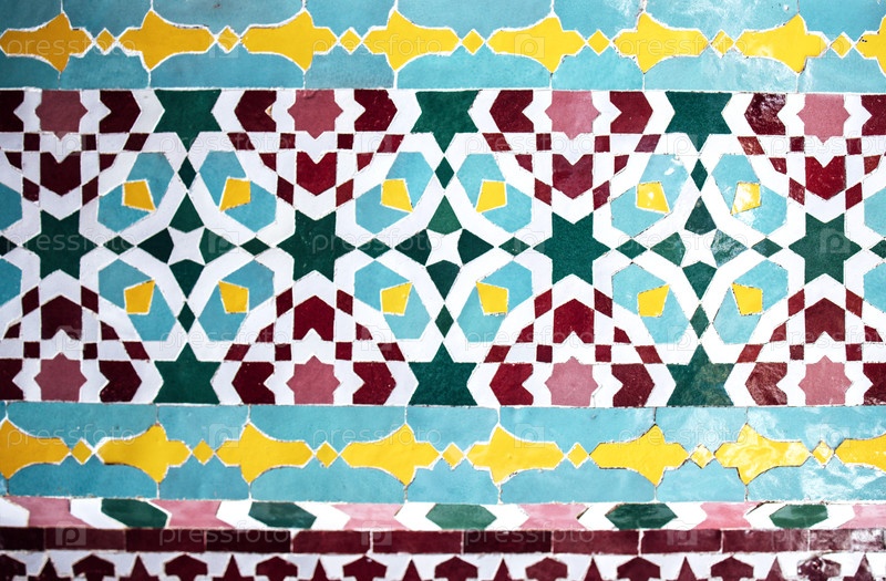 Красочный геометрический рисунок черепицы с сложными узорами в синих, зеленых, желтых и красных оттенках демонстрирует традиционное мастерство на декоративной стене
