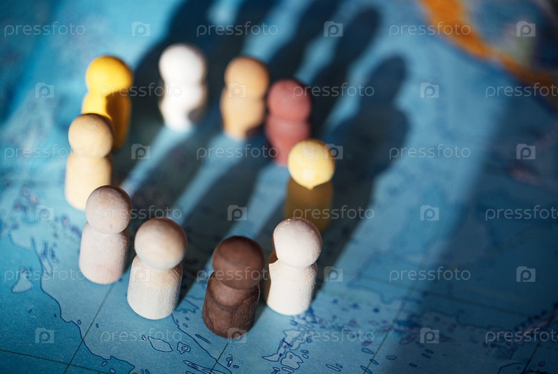 Группа деревянных фигур в различных цветах, расположенных по кругу на карте мира и бросающих тени, которые улучшают визуальную глубину сцены