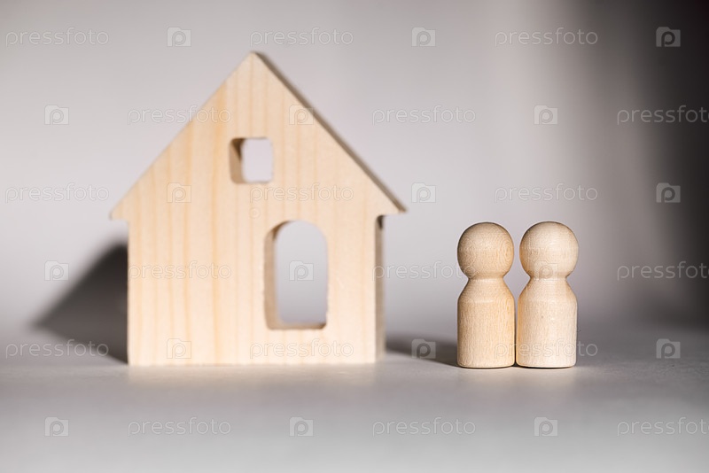 Деревянная модель дома рядом с двумя деревянными фигурками, представляющими пару, демонстрируя минималистический дизайн с мягким освещением и нейтральным фоном