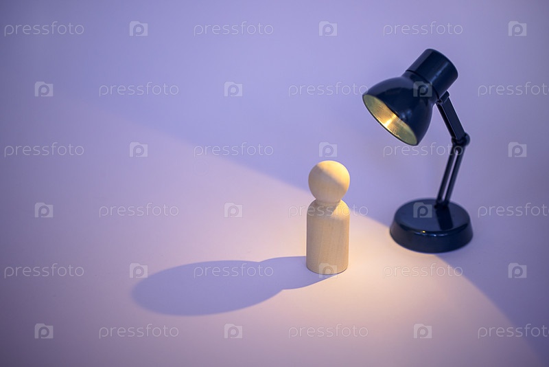 Деревянная статуэтка стоит под черной настольной лампой, бросающей теплый свет и тень на гладкую поверхность с мягким фиолетовым фоном