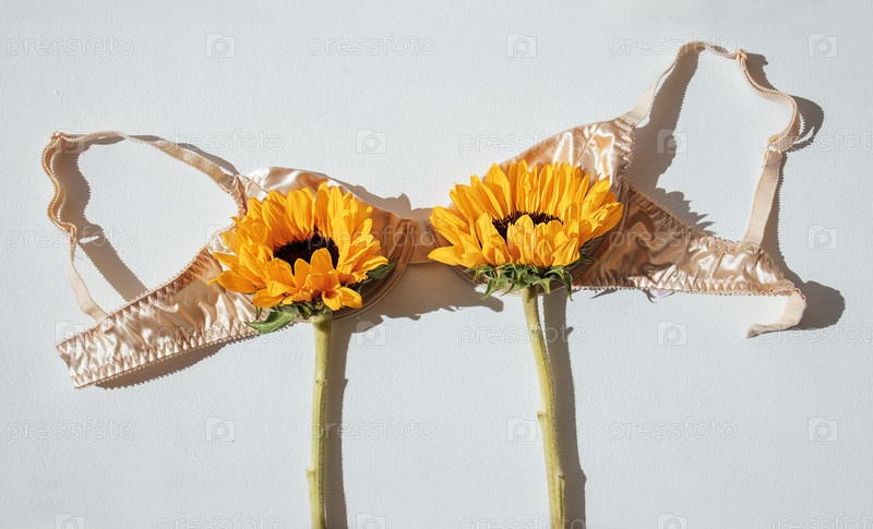 Бежевый атласный бюстгальтер с подсолнечными цветами, помещенными в чашки, расположен на белом фоне, демонстрируя уникальную цветочную и модную комбинацию
