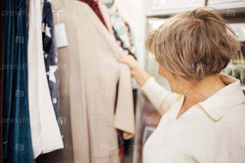 Пожилая женщина с короткими седыми волосами просматривает стойку для одежды в бутике, изучая бежевое пальто среди различных цветных изделий и тканей на выставке