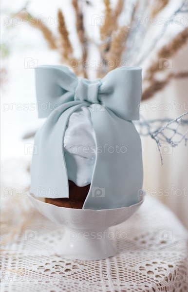 Декоративный торт с светло-синим луком фонданта, выставленным в белой фарфоровой миске на кружевной скатерти, окруженной сушеными цветочными аранжировками в мягко освещенном месте