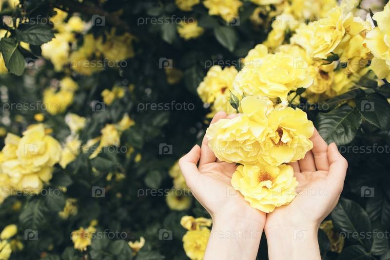 Руки, держащие яркие желтые розы в окружении пышного зеленого листья в садовой обстановке, демонстрируют красоту природы и цветочный уклад