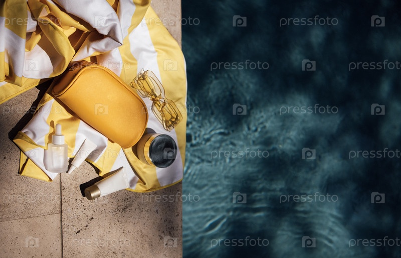 Желтое полосатое пляжное полотенце со солнцезащитными очками, продуктами по уходу за кожей и желтым корпусом на каменной поверхности рядом с бассейном с чистой водой