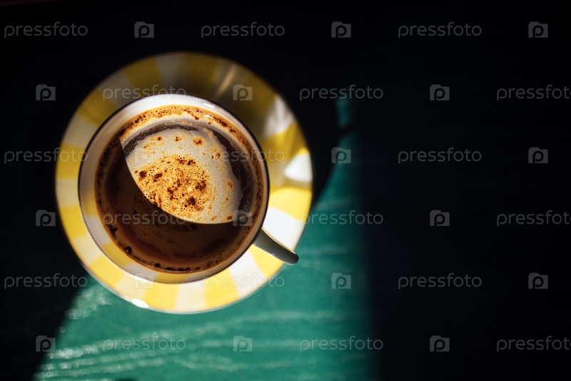 Кофейная чашка с пенной поверхностью и рассыпанным какао-порошком на желтой полосатой тарелке, размещенной на зеленом деревянном столе с контрастным светом и тенью
