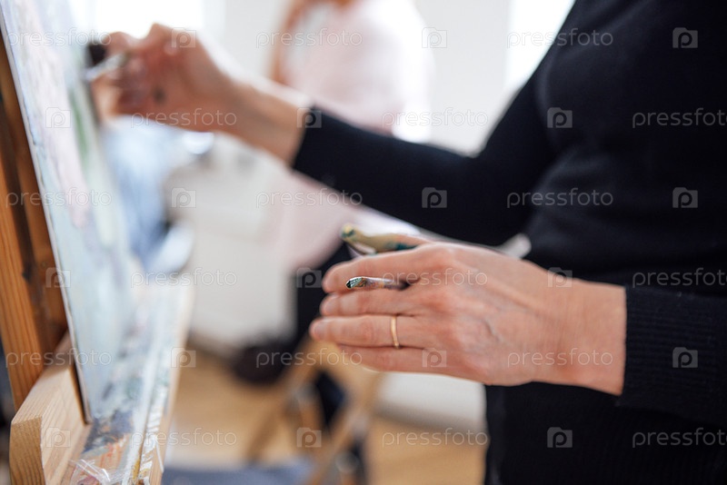 Художница рисует на холсте с кистью в руке, эстафета расположена в яркой студии, другой художник виден на заднем плане