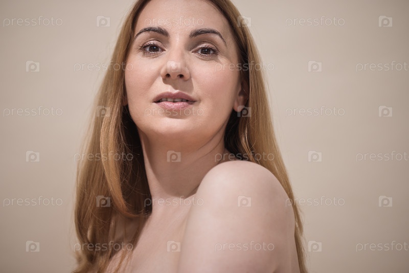 Красивая женщина с длинными волосами уверенно позирует на нейтральном фоне, демонстрируя естественную красоту и элегантность в стиле портрета, подчеркивая самовыражение и расширение возможностей