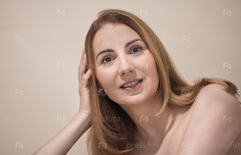 Женщина с длинными коричневыми волосами, нежно улыбающаяся, положив руку на голову на мягком бежевом фоне, излучает тепло и уверенность в спокойной атмосфере
