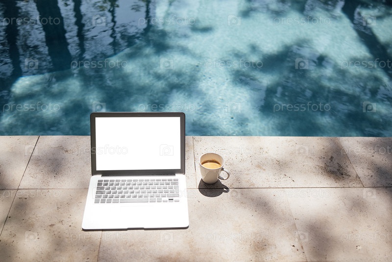 Ноутбук с пустым экраном расположен на каменной поверхности рядом с бассейном, в сопровождении чашки кофе, окруженный отражениями деревьев и солнечного света