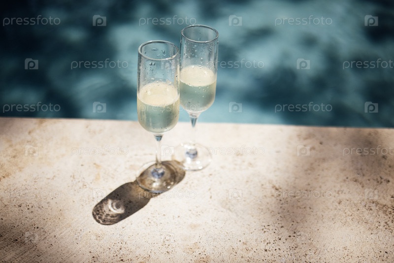Две флейты шампанского, наполненные игристым напитком, расположены на каменной поверхности рядом с бассейном, а отражения воды видны в фоне