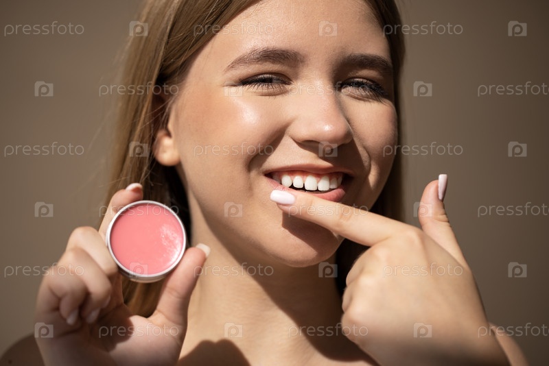 Молодая женщина с длинными волосами улыбается, держа в руках круглый контейнер красного цвета, демонстрируя применение косметических продуктов и радостное выражение лица при естественном свете