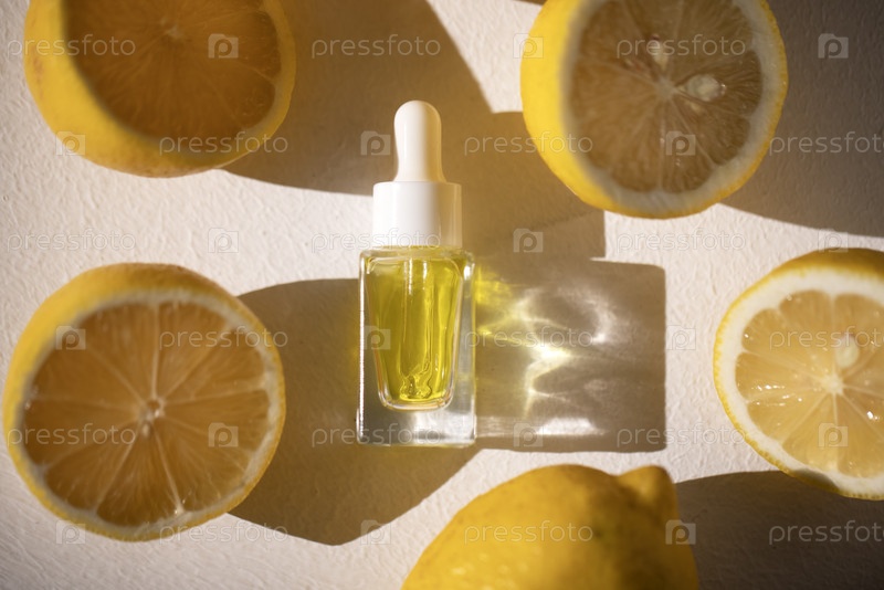 Стеклянная бутылка с капелькой, наполненная желтым маслом, окружена свежими лимонными половинками и целыми лимонами на светлом фоне, демонстрируя натуральные ингредиенты для ухода за кожей