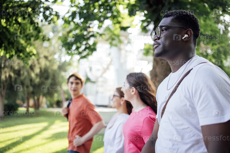 Группа разнообразных друзей гуляют вместе в солнечном парке, наслаждаясь природой и компанией друг друга, демонстрируя дружбу и досуг на открытом воздухе