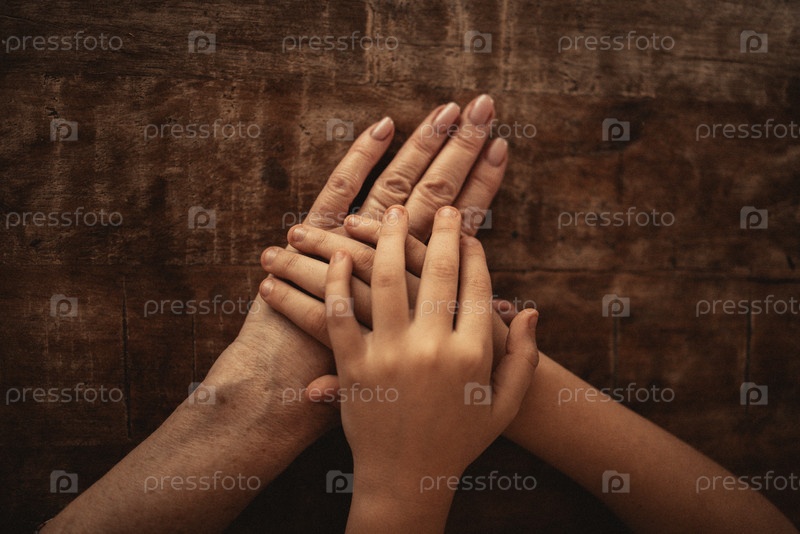 Руки разных возрастов и оттенков кожи помещены вместе на деревянной поверхности, символизируя связь и единство между поколениями в теплой природной обстановке