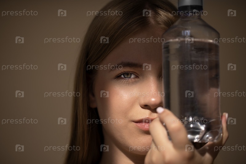 Молодая женщина с длинными волосами держит бутылку чистой воды рядом со своим лицом, демонстрируя гидратацию и оздоровление, при этом мягкое освещение улучшает ее естественную красоту и выражение