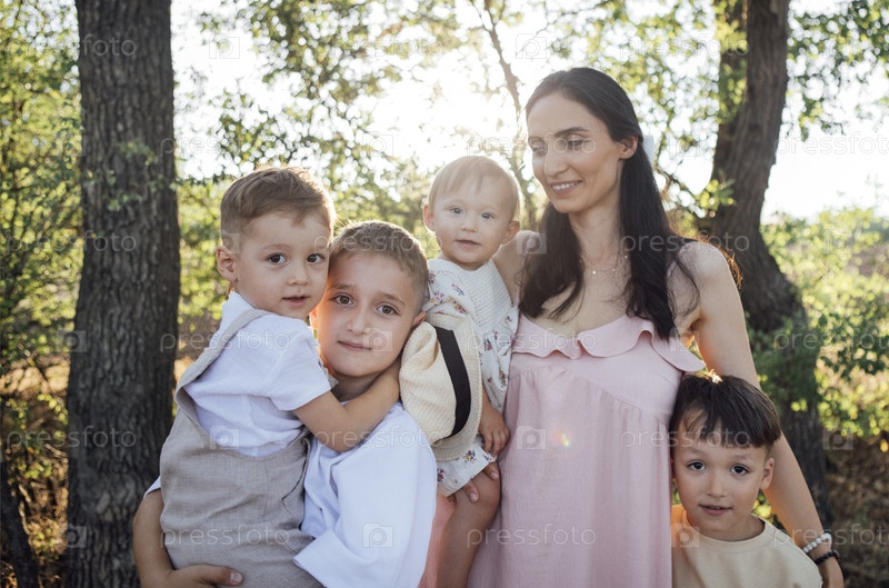 Женщина, держащая детей в солнечной атмосфере на открытом воздухе, окруженная деревьями, демонстрирует радостный семейный момент с теплом и связью в объятиях природы