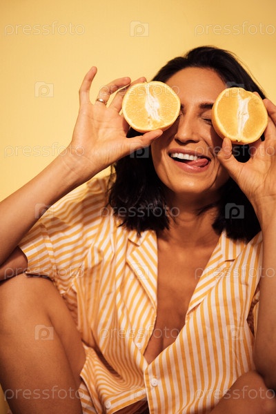 Женщина с темными волосами игриво держит перед глазами оранжевые половинки, одетая в полосатую рубашку, радостно улыбаясь на ярком желтом фоне, захватывая веселый и оживленный момент