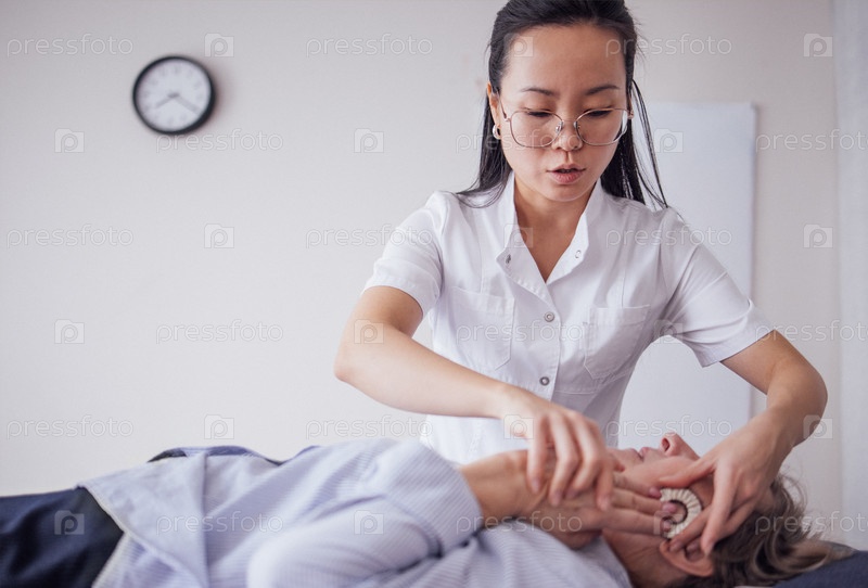 Женщина-киропрактик в белой форме регулирует шею пациента, лежащего на столе лечения в современной клинике с часами на стене и минималистическим декором