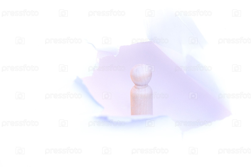 Деревянная статуэтка стоит прямо на разорванном фоне белой бумаги, демонстрируя минималистский дизайн с мягким освещением, подчеркивающим текстуру и форму фигуры