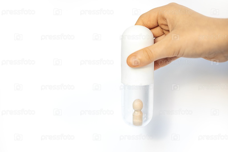 Рука держит прозрачную капсулу с деревянной фигурой внутри, демонстрируя уникальную концепцию дизайна упаковки для здоровья, оздоровления или лекарств