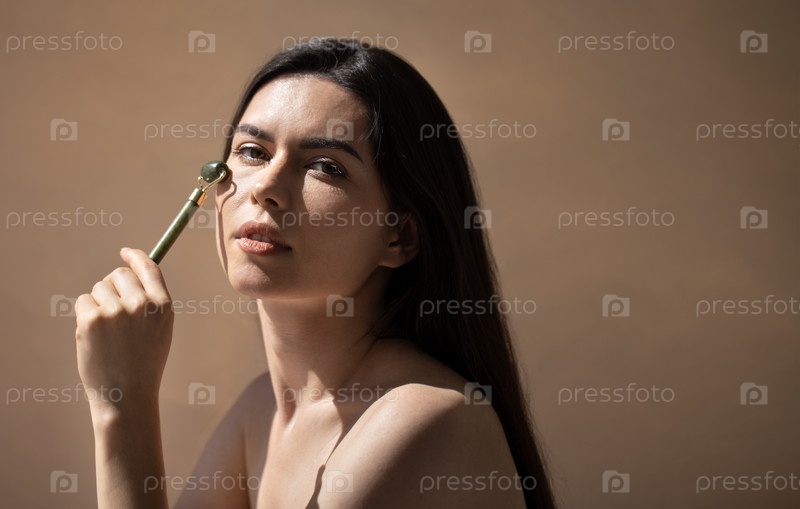 Брюнетка использует нефритовый ролик на лице, демонстрируя рутину ухода за кожей, с мягким освещением и нейтральным фоном, подчеркивая практики красоты и самообслуживания