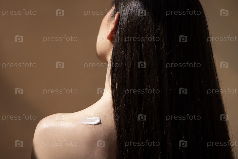 Женская модель с длинными темными волосами наносит крем для тела на плечо, мягкое освещение подчеркивает гладкую кожу на нейтральном фоне