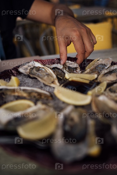 Рука человека, выбирающего свежие устрицы с большой тарелки, украшенной лимонными ломтиками и подаваемой на льду в непринужденном ресторане