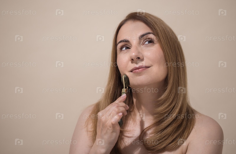 Женщина с длинными коричневыми волосами продуманно использует ролик для лица на щеке, демонстрируя рутину красоты в спокойной минималистической обстановке с мягким освещением и нейтральными тонами