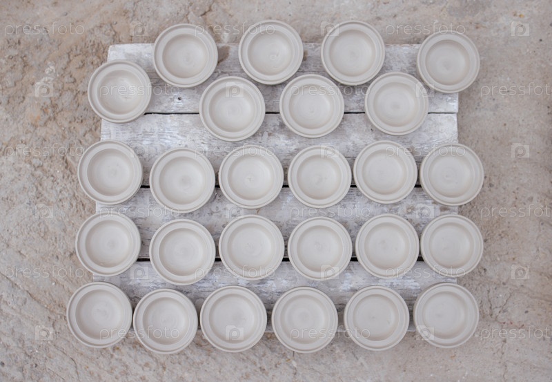 Круговые серые керамические миски, расположенные в сетке на деревянном поддоне с текстурированной бетонной поверхностью, видимой под установкой