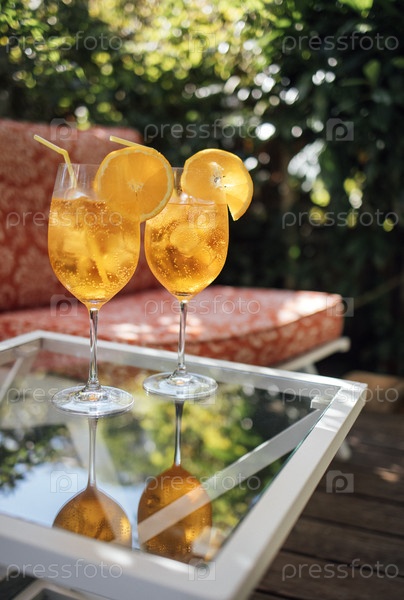 Два освежающих апельсиновых коктейля со льдом и лимонными ломтиками, подаваемые в высоких бокалах на стеклянном столе в садовой обстановке с зеленью на заднем плане