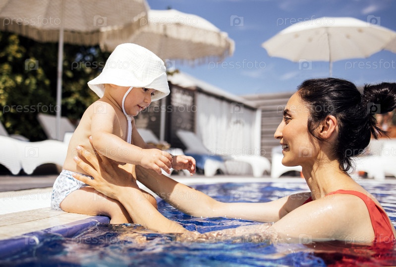 Мать и младенец наслаждаются игривыми моментами в бассейне, окруженные шезлонгами и зонтиками, захватывая радостный летний опыт семейного общения