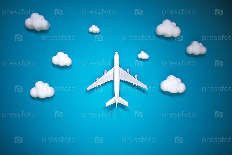 Модель самолета летит над пушистыми белыми облаками на ярко-синем фоне, представляя путешествия, авиацию и исследования в игривом и творческом дизайне