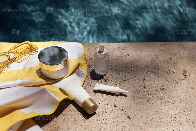 Продукты по уходу за кожей, включая крем, сыворотку и солнцезащитный крем, размещаются на подсвеченной солнцем каменной поверхности рядом с бассейном с чистой голубой водой