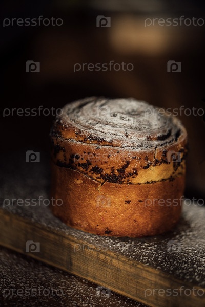Свежевыпеченный ролик корицы с золотисто-коричневой корой и сахарным порошком, помещенный на деревянную доску в рустичной кухне