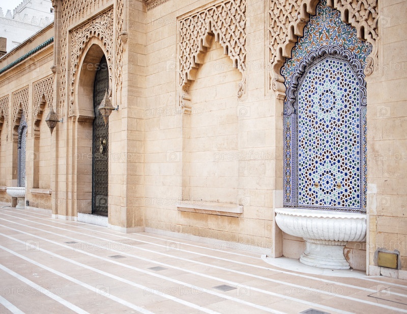 Украшенная архитектурная стена с сложными узорами и красочной плиточной работой, со спокойным двором и элегантными каменными дорожками, демонстрирующими традиционное ремесло и культурное наследие