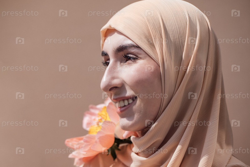 Мусульманка в светло-бежевом хиджабе улыбается, держа розовый цветок, демонстрируя радость и красоту в спокойной среде с естественным светом
