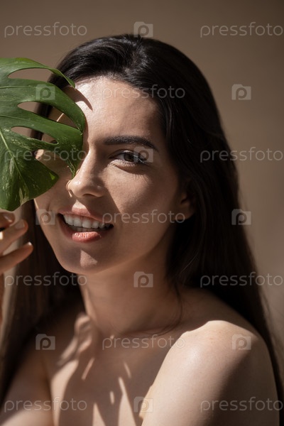 Молодая женщина с длинными темными волосами игриво держит зеленый лист перед лицом, демонстрируя естественную красоту и спокойное выражение лица в мягком освещении