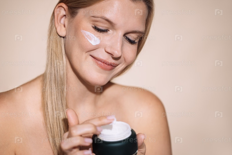 Женщина наносит увлажняющий крем на лицо с нежной улыбкой, демонстрируя рутину по уходу за кожей, при мягком освещении и нейтральном фоне улучшает концепцию красоты и самообслуживания