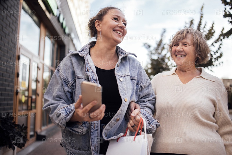 Две женщины вместе гуляют за пределами магазина, одна держит смартфон и сумку для покупок, оба улыбаются и наслаждаются своим временем в городской обстановке