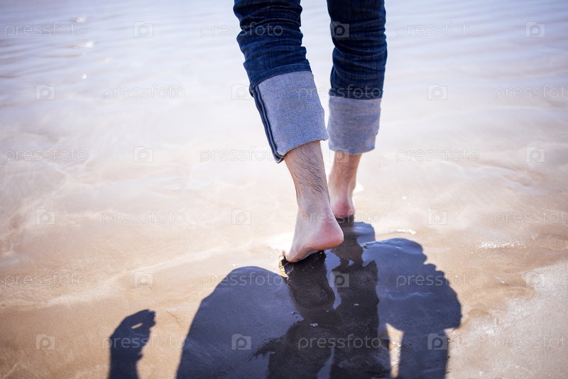 Босоногий человек, идущий вдоль береговой линии, с волнами, мягко лапающими ноги, создавая отражения на влажном песке, пробуждая чувство спокойствия и связи с природой