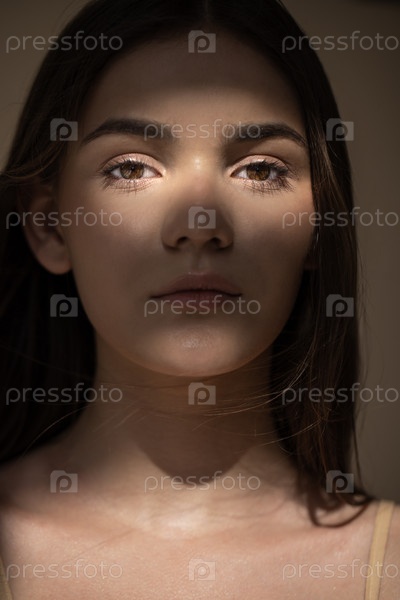 Молодая женщина с длинными темными волосами, освещенная мягким светом, бросает тени на ее лицо, создавая драматический и художественный портрет с эмоциональной глубиной и интригой