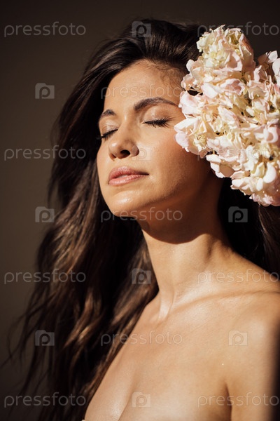 Красивая женщина с длинными темными волосами, украшенные розовыми цветами, закрытые глаза, наслаждающаяся моментом спокойствия и безмятежности в мягком естественном освещении, воплощающем красоту и мир