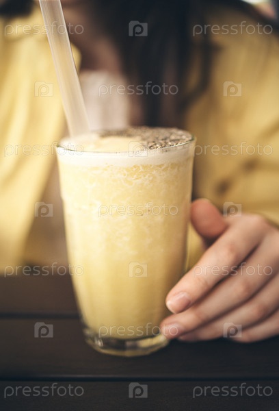 Близкий план руки, держащей стакан желтого коктейля соломой на деревянном столе; мягкий фокус человека в желтой куртке