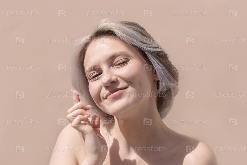 Молодая женщина с светлыми волосами улыбается и делает жест надежды на мягком бежевом фоне, излучая позитив и радость в спокойной атмосфере