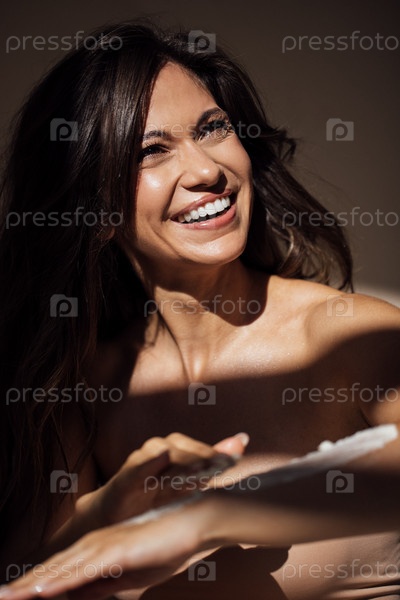 Улыбающаяся женщина с длинными волосами, наслаждаясь моментом радости во время нанесения продукта по уходу за кожей, освещенная мягким естественным светом, демонстрируя красоту и рутину самообслуживания