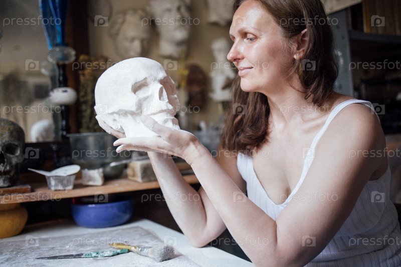 Художница, держащая скульптурный череп в творческой студии, окружена предметами искусства и скульптурами, демонстрируя художественный процесс и мастерство в яркой среде