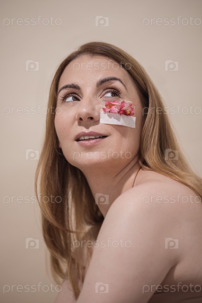 Женщина с длинными волосами, украшенная цветочным орнаментом на щеке, задумчиво смотрит, демонстрируя красоту и самовыражение в спокойной комнате