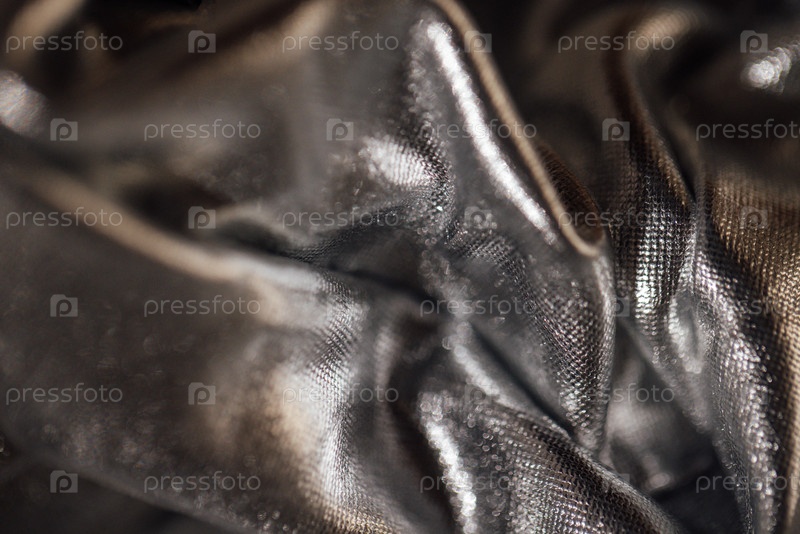 Близкий план морщинистой черной ткани с блестящей текстурой, демонстрирующей сложные детали и отражения при мягком освещении, идеально подходит для текстильных и модных приложений