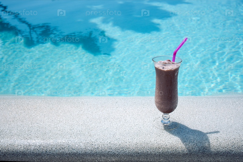 Шоколадный смузи в высоком стакане с розовой соломинкой, расположенной на каменном выступе рядом с прозрачным голубым бассейном, отражающим солнечный свет